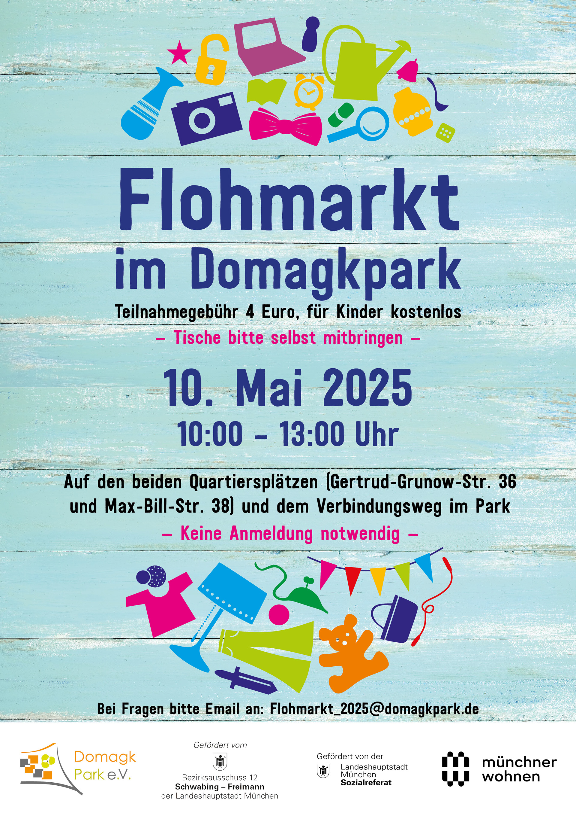 Beim Flohmarkt im Domagkpark können alte Schätze verkauft und neue Lieblingsstücke erworben werden.Wir laden alle herzlich ein, zum Stöbern vorbeizukommen!Wir freuen uns auf einen tollen Flohmarkt-Tag mit euch!