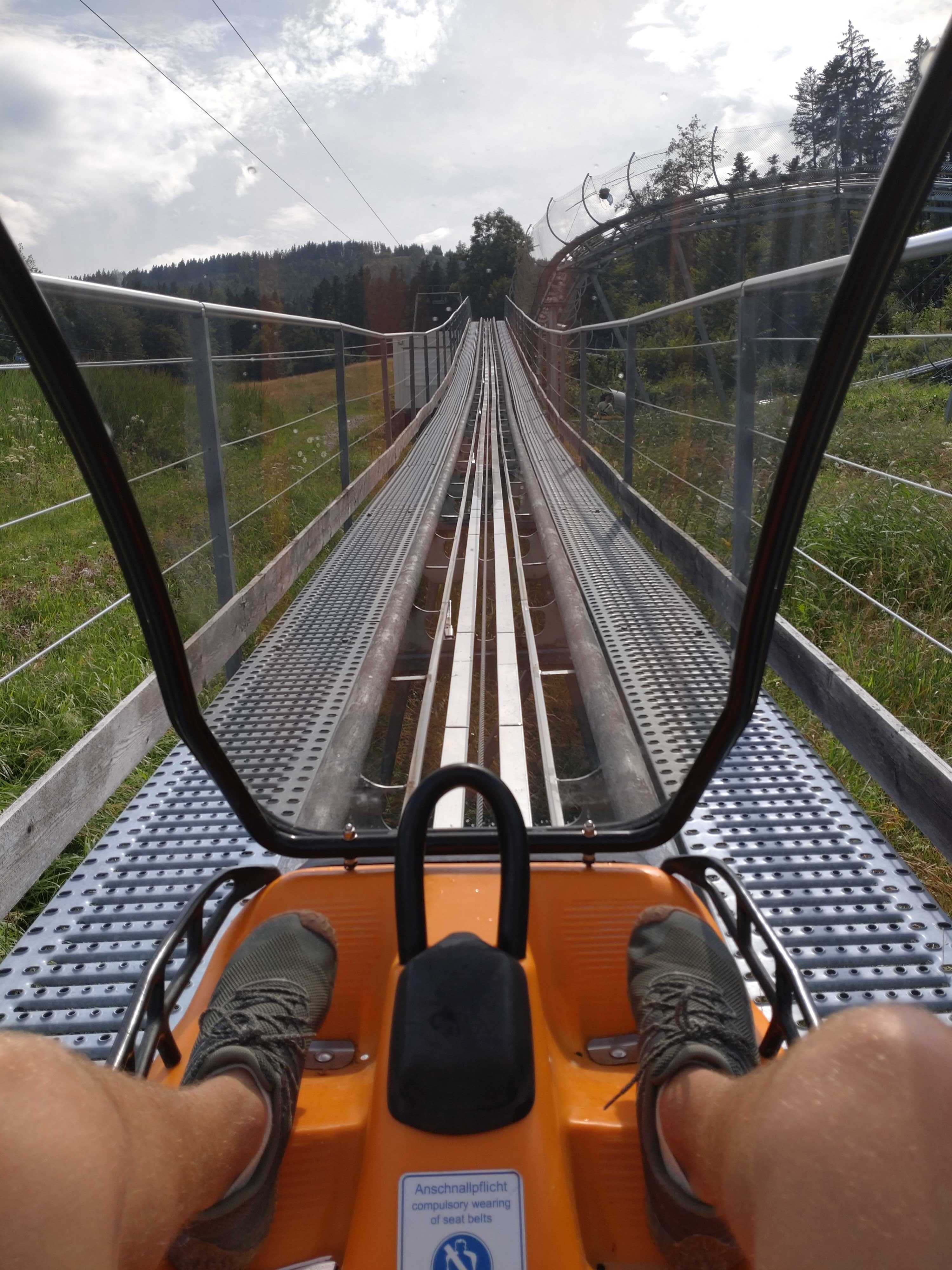 Mit bis zu 40 km/h den Berg hinunter! Doch bevor es runter geht, müssen wir hoch hinauf. Gemeinsam besteigen wir den Blomberg und genießen das großartige Voralpenpanorama. Nach einer Stärkung am Gipfel geht es weiter zum Blombergblitz, einer schienengeführten Sommerrodelbahn, auf der wir es so richtig krachen lassen können!