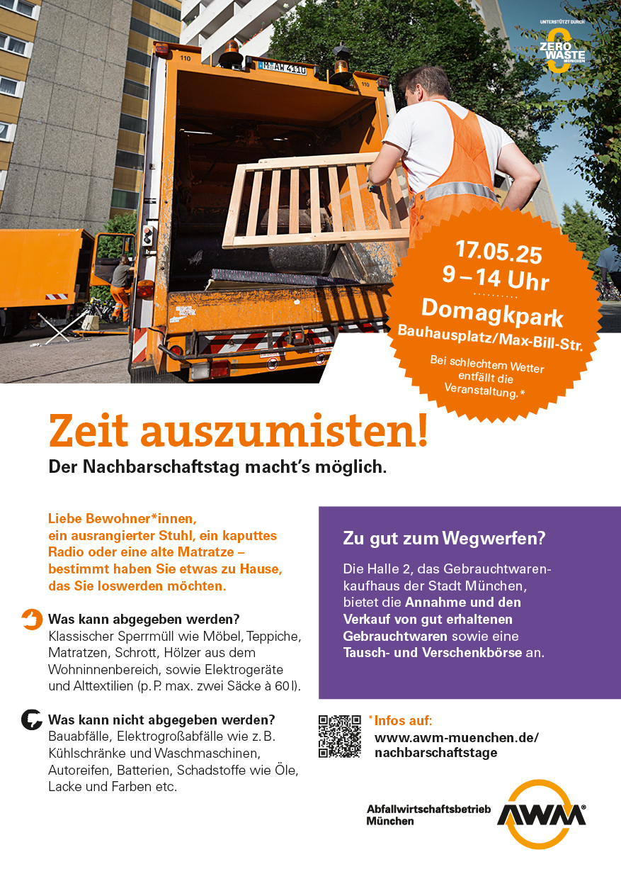 Doch nicht alles muss weggeworfen werden! Die Halle 2, das Gebrauchtwarenkaufhaus der Stadt München, ist mit einer Tausch- und Verschenkbörse vor Ort. Alle gut erhaltenen Gegenstände, die am Nachbarschaftstag kein neues Zuhause finden sollten, werden in die Halle 2 gebracht und dort zu einem günstigen Preis wiederverkauft.